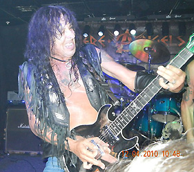 (Photo by John Harrell) - The Original Guitarists of W.A.S.P., now of 'Where Angels Suffer' that took place on Fort Myers Beach, Tuesday, 16th November, 2010 by Glenn Milligan Glenn: From your humble beginnings, what got you into music in the 1st place? Chris: You wanna ask me that? Glenn: Yeah. Chris: The Drugs. Cheers. (Laughs). Yeah drugs and alcohol - that's the main thing. Glenn: Nothing to do with the music then? Chris: It works along with the music - you feel good, play good and if you feel bad, you play bad and if you didn't do drugs you're an outcast from where I'm from. Glenn: So what would you say your favourite bands were that got you interested in playing music? Chris: It's all guitar bands - Johnny Winter, Robin Trower, Jimi Hendrix. I'm getting too old to remember all of 'em. I should have taken a picture of all the pictures on my walls. You know this guy I was talking to he had pictures of me and Randy on his walls and I was cracking up because I was thinking about my walls when I was a kid. (Laughs). You ought to have seen them - I had everyone plastered on my walls. I remember having an Alvin Lee picture - he had a watch on and I saying, "Why would he have his watch on stage?" (laughs) and then half the time I'm I'd be playing and I'd be going, "Oh man, my watch is on". You know it gets all sweaty and stinky- but back to the drugs - yeah. That was an influence playing music and sh*t with all my buddies and smoke pot. They used to spreay paraquat on it - that was something in Mexico that would get you double high. Anyway, we roll up some some joints and play a... Randy: Listen to (Black) Sabbath? Chris: Yeah.And try and play Black Sabbath on acoustic guitars. Randy: Still though with electric strings. Chris: Oh yeah.You know on catgetch guitars - you ever seen those? Randy: Flamenco. Glenn: Right. Chris: You know Charl - 'The Hoochie Coochie Mama' - you can kinda put electric strings on those with double neck bows (laughs).