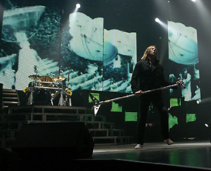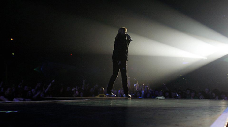 As emotionally charged female punters around the floor appear to dissolve into tears, Mick Mars, the band’s resident senior citizen dissolves into his not-too-short short but mercifully sweet solo spot with a sharp rendition of 'Voodoo Chile (Slight Return)' to prevent things from dragging. 'Looks that Kill', accompanied by another family-New-Year’s-eve-do’s equivalents worth of pyros, separates it from Tommy’s drum spot. Unlike the sort that would have most of the floor fighting to retreat for the bar, Mr Lee’s nine-minute stint is something of an unexpected show-stealer. Despite the irritating techno lines he applies his solos along to, he resorts to performing it on his head as his kit itself performs a full 360 loop on the special purpose-built track erected centre stage, stopping at the top for long incredible moments.